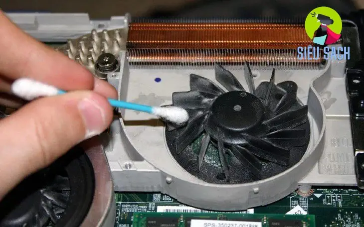 Loại bỏ bụi bẩn bằng cọ và tăm bông: Dùng cọ mềm quét sạch bụi bẩn trên bề mặt quạt và các khe tản nhiệt. Dùng tăm bông để làm sạch các khe nhỏ và khu vực khó tiếp cận.